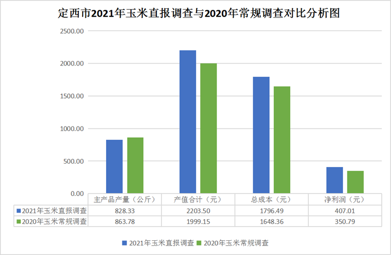 为及时掌握全市秋收玉米产销及市场价格变动情况,准确研判价格走势,保障粮食生产安全,定西市发展和改革委员会对临洮县2021年的玉米种植成本与收益情况进行了调查。调查显示,与上年常规调查数据相比,2021年玉米产量减少,价格上涨,产值增加,成本上升,利润增加。 通过调查数据分析,定西市2021年玉米直报调查亩均产量828.33公斤,比2020年常规调查(以下简称上年)863.78公斤减产35.45公斤,减幅4%。2021年玉米每50公斤出售价格130.18元,比上年112.67元上涨17.51元,涨幅15.54%。2021年玉米每亩产值合计2203.5元,比上年1999.15元增加204.35元,增幅10.22%。2021年玉米每亩总成本1796.49元,比上年1648.36元增加148.13元,增幅8.99%。2021年玉米每亩净利润407.01元,比上年350.79元增加56.22元,增幅16.03%。