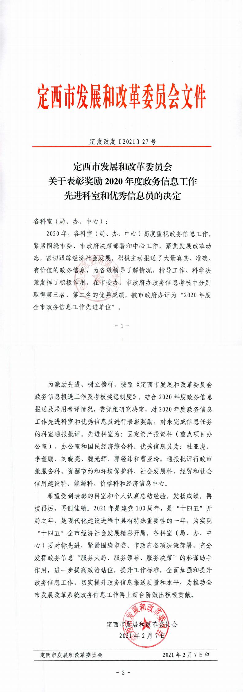关于表彰奖励2020年度政务信息工作先进科室和优秀信息员的决定