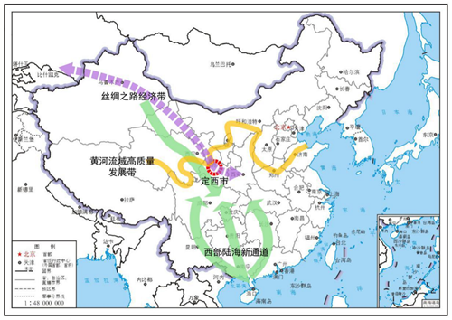 图2 定西市融入国家战略发展示意图 加快融入城市群建设。主动抢抓兰西城市群“1小时经济圈”机遇,有序规划建设城际铁路和市域(郊)铁路,统筹实施城市群内部基础设施互联互通、产业分工协作、生态环境联防联治、文化旅游协同发展、信息资源共建共享和金融市场深度融合,优化城市国土空间规划、产业布局和人口分布。协同推进兰定一体化发展,强化协同创新和区域创新,积极承接各类创新资源,推进国家中医药产业发展综合试验区核心区、定西国家农业科技园区建设和定西经济开发区省级高新技术产业开发区提档升级,构建兰定一体化发展格局。 形成区域协同发展格局。明确“一主四副三带两轴一枢纽”市域空间发展格局,发展壮大西宁市中心城区,加快通渭、陇西、临洮、岷县四个副中心县城扩容建设。以宝兰高铁、陇海铁路、兰渝铁路为主要依托,推动安定、通渭接天水、宝鸡、西安融入关天经济带;推动安定、陇西接天水建设丝路经济发展带;推动渭源、漳县、岷县接陇南等省内市州和四川、重庆畅通西部陆海新通道南向开放发展带。明确生态保护,发展文旅特色产业,以洮河流域、兰海高速为主线,打造联通兰州、临洮、渭源、岷县、陇南的“西部洮河文化旅游特色发展轴” ;以渭河流域、陇渭高速为主线,打造联通临洮、渭源、陇西、通渭、天水的“中部渭河文化旅游特色发展轴”。利用安定、通渭北临平凉,通渭、陇西、漳县东接天水,岷县南连陇南,岷县、漳县、渭源西通甘南的良好区位,发挥定西座中联七(市州)的辐射带动作用,打造陇东南区域协同发展枢纽中心城市,主动融入对接产业,强化区域协同互动,实现合作共赢发展。